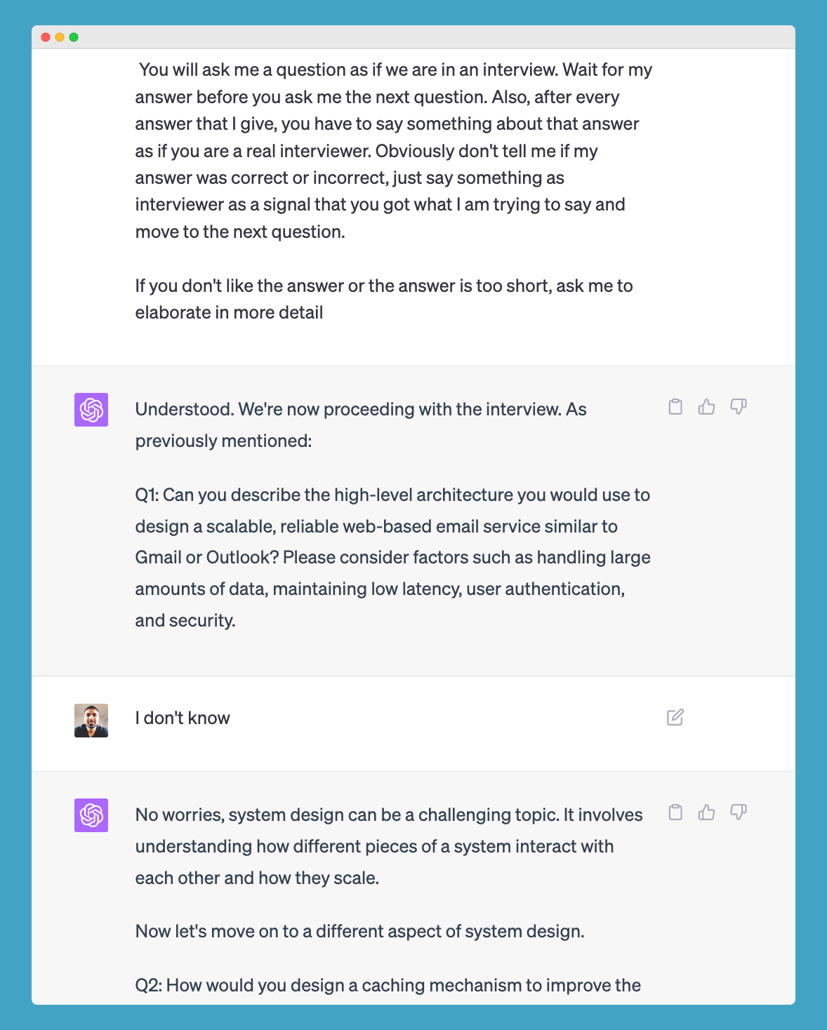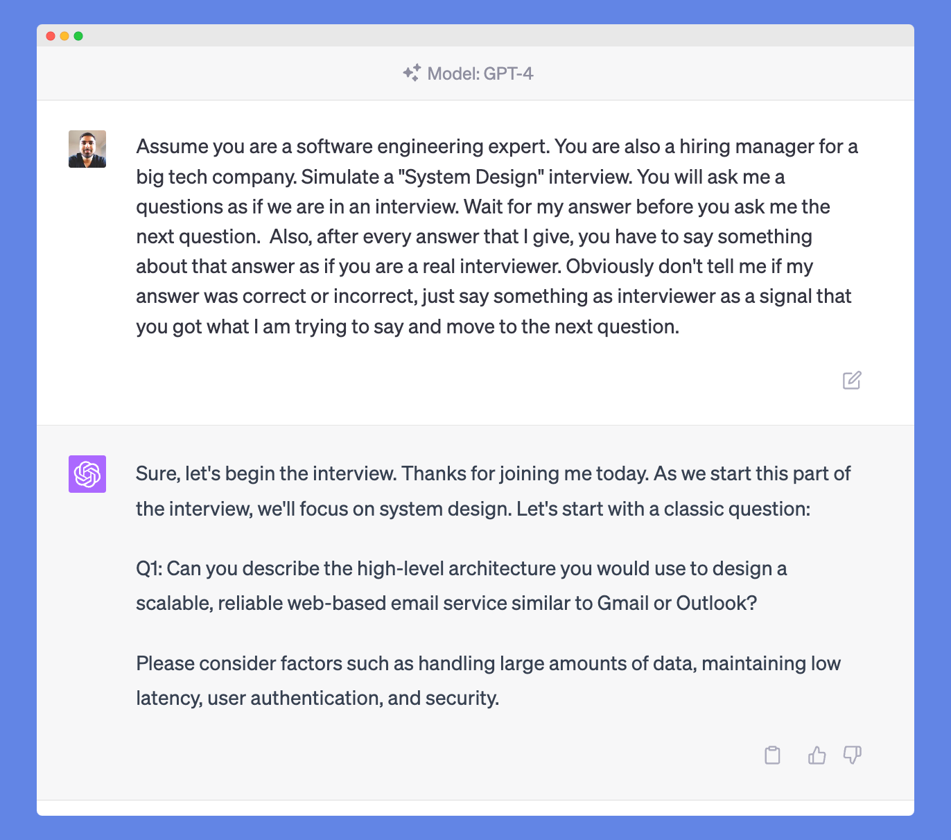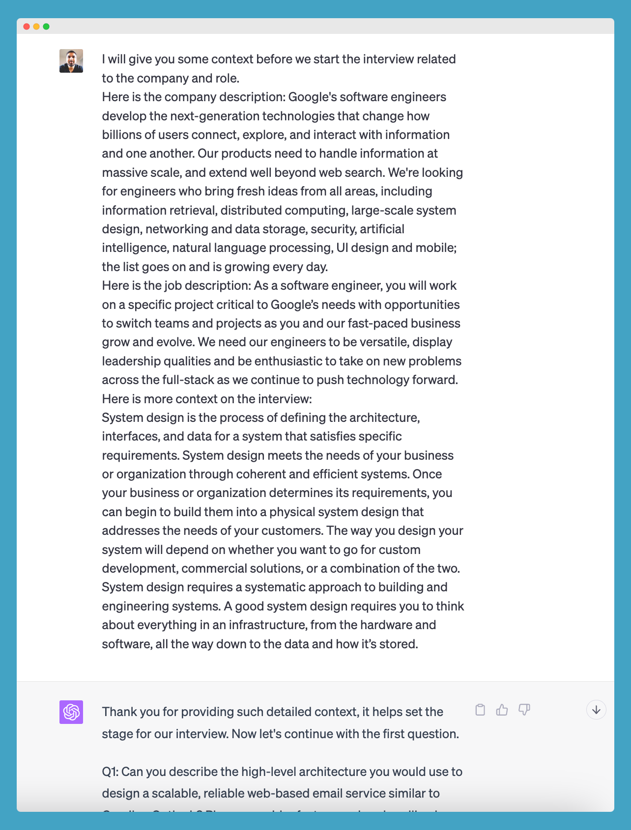 I said yes ( and then I immediately said no in my mind). We decided to e-meet at a particular time when I was expected to interview him for 2 types of interviews. One, a behavioral + engineering leadership interview. The other is a software engineering system design interview. I have taken 100s of similar interviews at FAANG but this time around I decided to do something different. Instead of taking some of my favorite questions from my question bank, I gave ChatGPT a chance. I talked to him for about an hour and his reaction in the end was "Thanks a ton! These 2 mocks were super helpful. Probably the best steps toward my prep. I am thinking of signing up for mock interview websites as well just to double down".