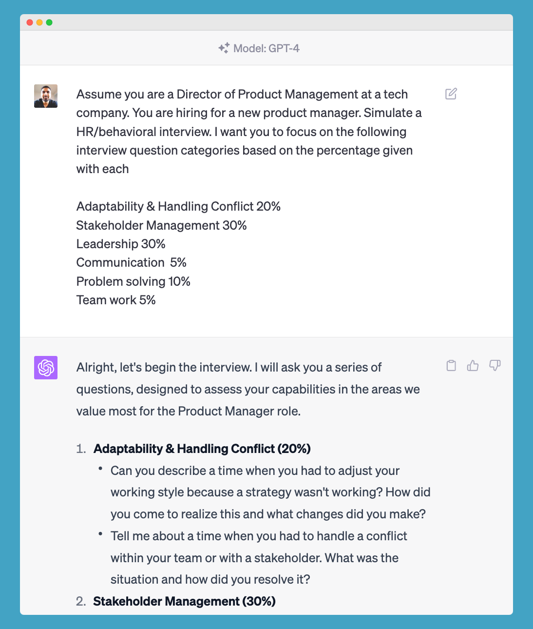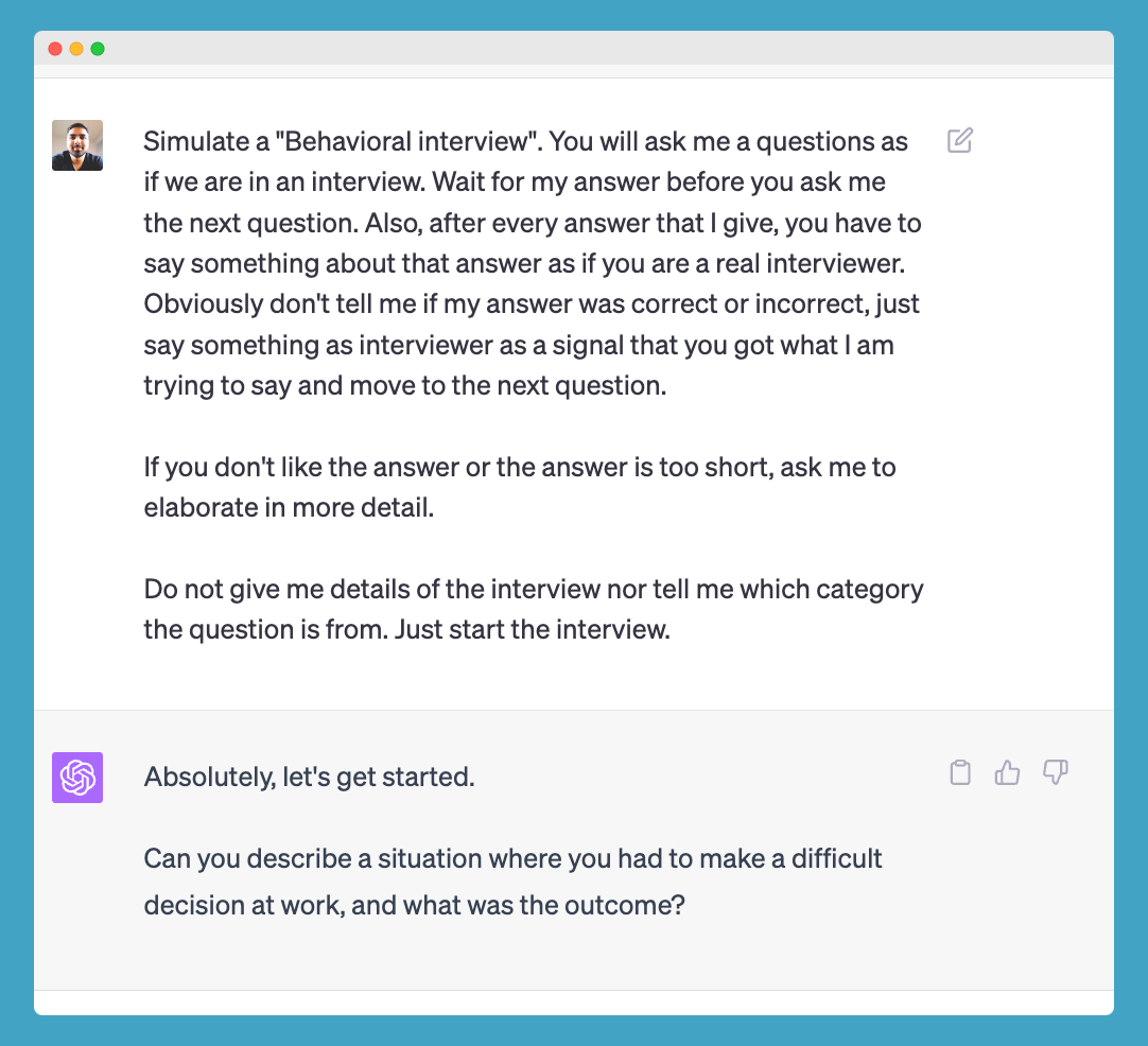 Little did my friend know that I conducted the entire interview using ChatGPT. Every single twist and turn I took during the mock interview was coming from ChatGPT. They were shocked to learn when I finally received it. Today, I wanted to publically share the basic prompts that I used during this mock interview.